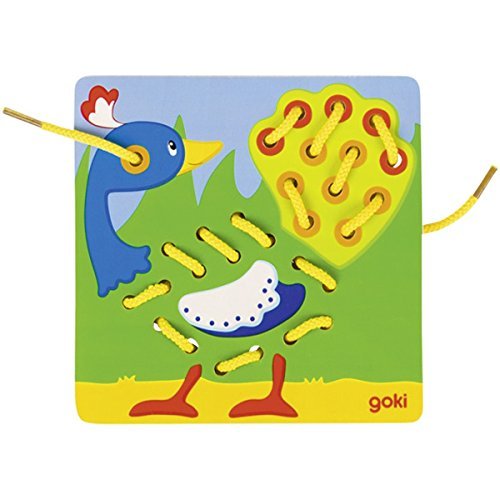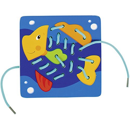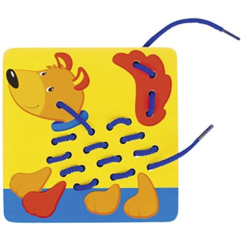 5 cords, 5 pictures. What's missing? someone to thread the cords through the wooden tiles and complete the animals. This playfully supports the fine motor skills.