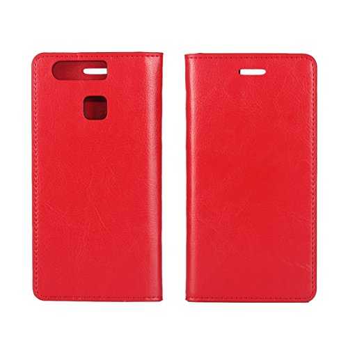 Golikef Huawei P9 ケース カバー バンパー 手帳型 高級 本革 レザー 色鮮やか レトロ な book case 型 柔らかいシリコンTPUラバーカバー スタンド機能 カード収納機能 アイフォン 手帳 スマホケース カード収納ポケット付き マグネット式 ストラップ付き スマートフォン保護ケース 両面プリントデザイン レッド