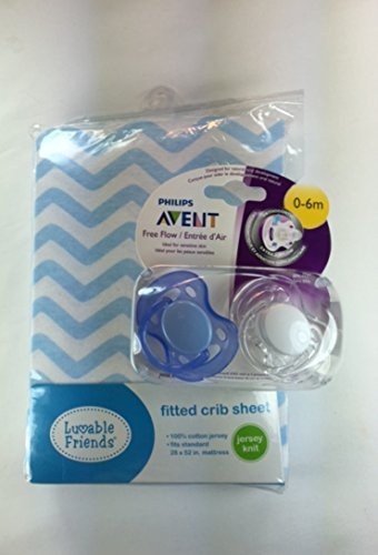 Baby Boy Gift Bundle - 2 Items: Luvable Friends Fitted Crib Sheet (Single) and Philips Avent Silicone Free Flow Pacifier (2 Pack).