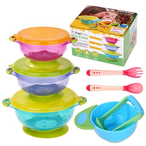 Baby Bowls Kaptron Set of 3 Suction Baby Feeding Bowls Set with Food Masher Spoon and Fork Feeding bowls for toddlers - 3 sizes FDA Approved BPA Free Stackable Spill Proof Suction Bowls with Lids