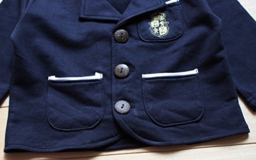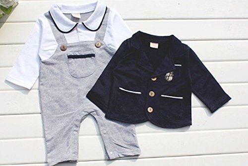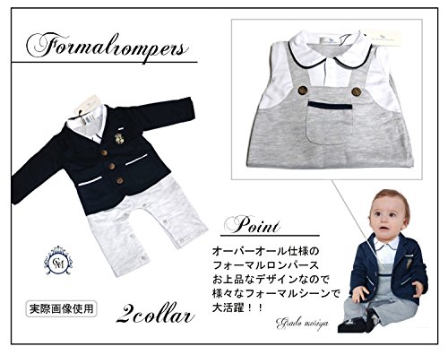 (グレードモリヤ) Grade moriya ベビー 用 ブレザー 付き オーバーオール 風 ロンパース フォーマルスーツ セット 男の子 ベビー ロンパース 子供服 ボーイズ 男の子 キッズ フォーマルスーツ セット 入学式 卒業式 入園式 卒園式 結婚式 冠婚葬祭 発表会 出産祝い プレゼント 蝶ネクタイ 男の子 スーツ キッズスーツ キッズ ブラック フォーマル お宮参り スーツ お出かけ 記念撮影に★ (90, ネイビーブレザー + グレーロンパース)