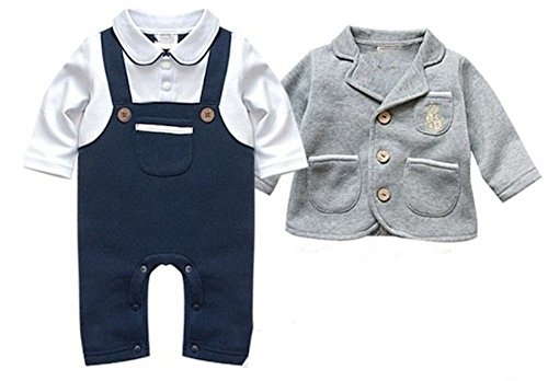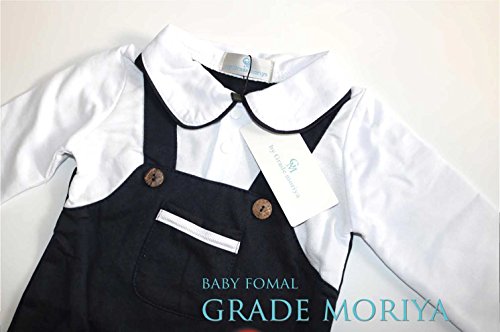 (グレードモリヤ) Grade moriya ベビー 用 ブレザー 付き オーバーオール 風 ロンパース フォーマルスーツ セット 男の子 ベビー ロンパース 子供服 ボーイズ 男の子 キッズ フォーマルスーツ セット 入学式 卒業式 入園式 卒園式 結婚式 冠婚葬祭 発表会 出産祝い プレゼント 蝶ネクタイ 男の子 スーツ キッズスーツ キッズ ブラック フォーマル お宮参り スーツ お出かけ 記念撮影に★ (90, グレーブレザー + ネイビーロンパース)
