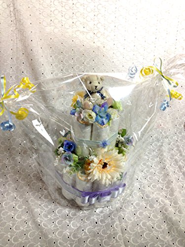 パンパース26個使用(個装) マスコット1個、アーティフィシャルフラワー多数、リボン2重 1段目の直径約20cm、高さ約30cm。 写真の出来上がりから更にセロファンでラッピング、くるくるリボンを付けて段ボール箱に入れお送りします。 Grandmaおむつケーキ専用Gift カード付き (内容4kg~8Kgのbaby用等と記入) カードにはお好きなメッセージをお入れする事も出来ます。