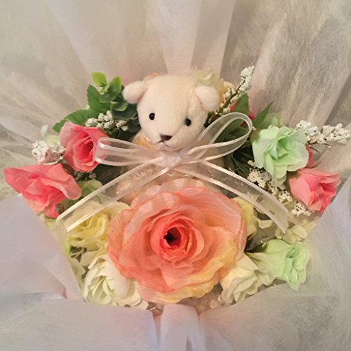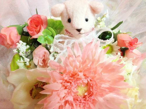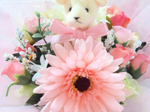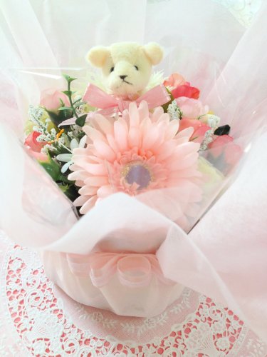 女の子用にピンク系でまとめています。 造花をマスコットの周りにアレンジしています。 埃をかぶらないようにセロファンでラッピングしています。ギフトカード(商品の内容を記入したカードをお付けしますので直送も可能です。) 御希望のメッセージを入れる事もできます。