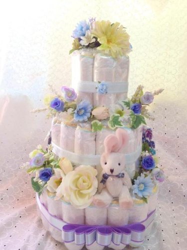 写真は一例ですがイメージはほとんど変わりません お花の入荷によりまったく同じ商品にはなりません 世界にたった一つのおむつケーキです。 (お花は造花ですので取り外しお好きなように再利用して頂けます。)