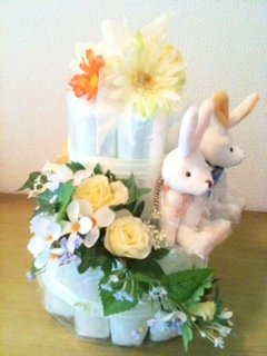 - パンパース26個を個装、マスコットを2つ(ベア)とお花を多数アレンジ
