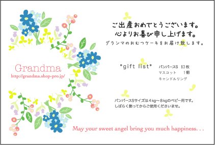 - 内容の書いたカード(おむつサイズや個数等記入)にメッセージも記入してあります。