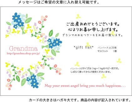 パンパースはじめての肌へのいちばんMサイズ26個使用(個装) マスコット1個、シルクフラワー多数、リボン2重 1段目の直径約20cm、高さ約30cm。 写真の出来上がりから更にセロファンでラッピング、くるくるリボンを付けて段ボール箱に入れお送りします。 Grandmaおむつケーキ専用Gift カード付き (内容4kg~8Kgのbaby用等と記入) カードにはお好きなメッセージをお入れする事も出来ます。 お花やマスコットは在庫により多少変化することもありますがイメージは変わりません。