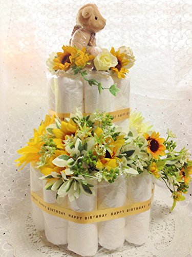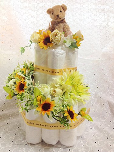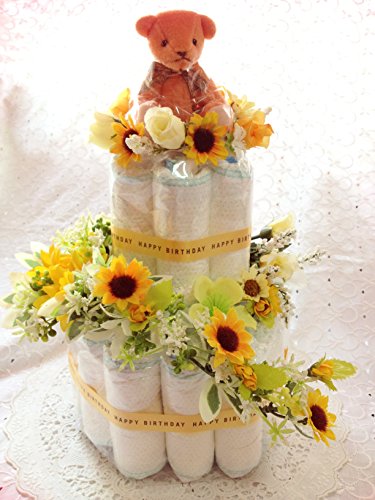 出産祝い 誕生祝い 人気大 可愛い オムツケーキ 2段 男女兼用 Sunflower (はじめての肌へのいちばんSサイズ)