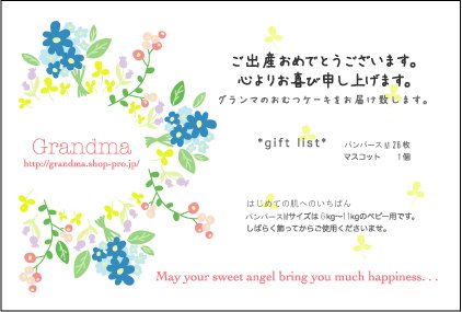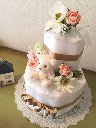 パンパースはじめての肌へのいちばんMサイズ25個使用(個装) マスコット1個、ミニブーケ3個 1段目の直径約23cm、高さ約30cm。 写真の出来上がりから更にセロファンでラッピング、くるくるリボンを付けて段ボール箱に入れお送りします。 Grandmaおむつケーキ専用Gift カード付き (内容4kg~8Kgのbaby用等と記入) カードにはお好きなメッセージをお入れする事も出来ます。