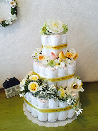 おむつケーキ3段 Happy Bird (パンパースS, イェロー) 豪華で上品な出産祝い