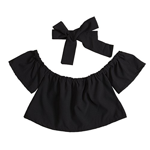 かわいい赤ちゃんガールズ無地オフショルダー伸縮性ファッション用フリル付きロンパースショートパンツブラウス+リボンカチューシャ2個入り カラー: ブラック