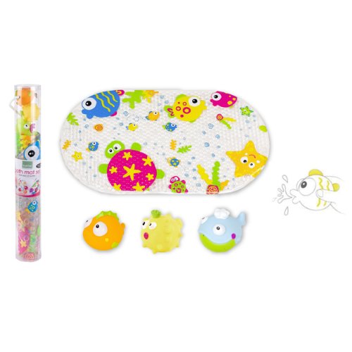 Fully suction cupped so it stays put in the bath tub;Creates a cushioned surface for your child to sit on while bathing;4 Piece set includes a bath mat and 3 squirter toys;Choose from a jungle or marine theme;Check out the shower curtain and hooks from Kushies which coordinate with this piece