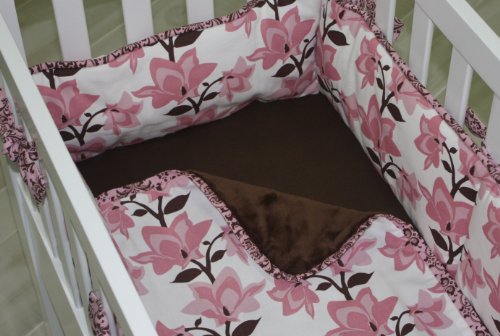 Color scheme is chocolate brown and rose pink;Sized to perfectly fit Green Frog Art cradles but will fit most standard sized (18 x 36 interior) cradles, both open ended and closed ended;Bumper constructed in one piece without zippers for baby's safety; multiple bumper ties to attach bumper securely to sides of cradle;Sheet may be machine washed; spot cleaning, hand washing or dry cleaning recommended for coverlet and bumper;Made in the United States of high quality decorator fabrics