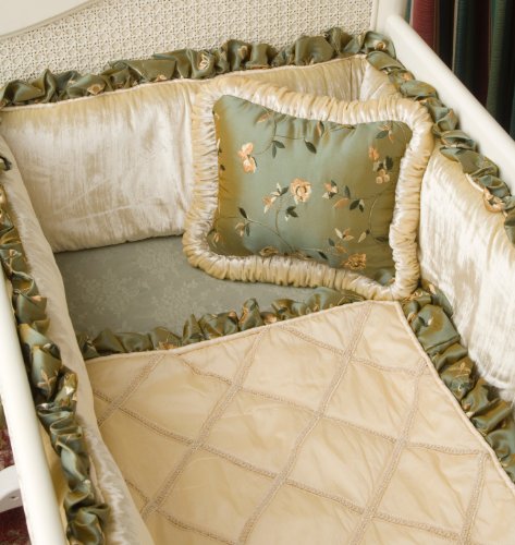 Color scheme is warm sage green (blueish tones rather than gray) and ivory with a touch of icey blue;Pillow size: 9 x 11;Spot cleaning, hand washing or dry cleaning recommended;Cradle bedding set available separately; made in the U.S.A. of high quality decorator fabrics;For decorative purposes only; do not place pillow in bed with sleeping infant