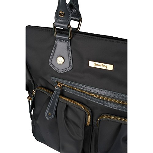 Spacious interior with 6 pockets (plus another 2 specifically to stow bottles) and a key clip plus two exterior bottle pockets - Removable changing pad with pocket for diapers and wipes- Removable wet bag for cloth diapers and soiled clothes - Removable and attachable insulated cold/hot Bottle Holder;Large zippered outer front compartment - Exterior back pocket to store backpack straps when not in use secured by snaps;Attaches easily to most strollers with Green Frog Stroller Clips (Included) - 2 easy ways to be carried: Purse style with adjustable straps or cross-body/on shoulder with long, adjustable strap;Bag rests on 4 gold-stamped bag pegs - All straps, zipper pulls and trimmings are crafted out of luxurious genuine leather - Stamped logo plate and premium hardware throughout bag inside and out;Dimensions: 17.5 W x 13H x 6 D. Long Strap Drop: 17-36 Weight: 3.5 lbs