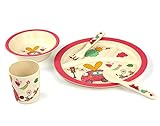 5-Piece Set Includes: large divided plate, bowl, cup, fork and spoon;Featuring the Green Frog Friends characters that all little kids love;Biodegradable, Eco-Friendly, BPA-Free, FDA Approved, Sustainable Bamboo Fiber;Dishwasher safe and easy to wash;Fun colorful design and ergonomically shaped
