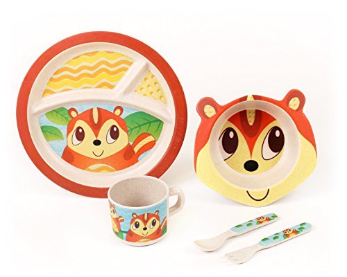 5-Piece Set Includes: large divided plate, bowl, cup, fork and spoon;Features the lovable Green Frog Friends characters that little kids will adore;Biodegradable, Eco-Friendly, BPA-Free, FDA Approved, Sustainable Bamboo Fiber;Dishwasher safe and easy to wash;Fun colorful design and ergonomically shaped