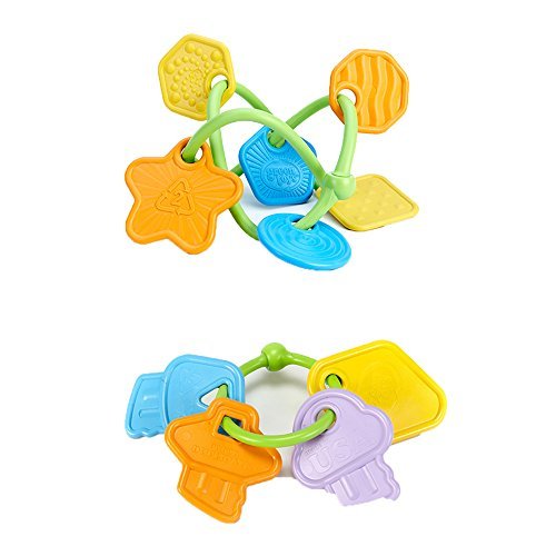 Manufacturers Description: My First Green ToysTM Rattle Keys. Made in the USA from food-safe, 100% recycled plastic milk jugs that save energy and reduce greenhouse gas emissions, the four colorful pieces swing freely on the lightweight ring, allowing little ones to easily grasp, shake, and explore different shapes, colors, and textures. With rounded edges and no external coatings, this is one set of keys parents can feel good about handing over. Tiny hands can easily grasp this lightweight, three dimensional, ultra-safe teether. Each uniquely shaped and colorful charm has a distinct texture to stimulate visual and tactile senses. No BPA, phthalates, or PVC, and also meets FDA food contact standards. Dishwasher safe for easy cleaning. Color combinations may vary.