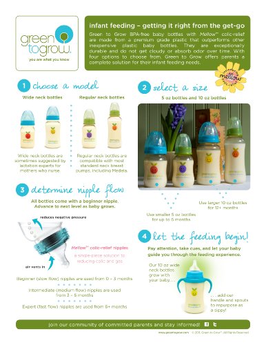Three fast flow (6 months and above) vented colic-relief regular neck silicone baby bottle nipples;Nitrosamine-free and made from a transparent, medical grade silicone that is heat-resistant, non-toxic, and odorless;Mellow colic-relief nipples vent air into the bottle to equalize pressure and calm baby;Green to Grow PES bottles received PTPA Media and iParenting awards for performance excellence