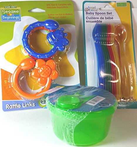 Bundle of 3 Baby Items (BPA free): 1-6 Piece Teething Rings, 1-12 Piece Set of Feeding Spoons, 1-3 Compartment Formula Container with Pouring Spout (Green) by Angel of Mine
