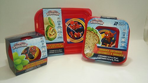 Spider-man Red Plastic Mini Snack Containers 4 in Pack 4fl oz;Spider-man Red Plastic Sandwich Container 2 in Pack 12.5 fl oz;1 Spider-man Red Plastic 3 Section Lunch Kit 22.5 fl oz .;All BPA Free Freezer, Microwave & Dishwasher Safe