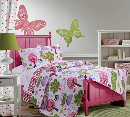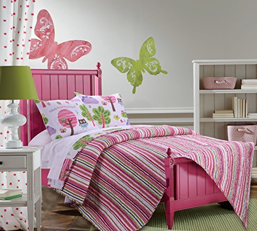 Let your child frolic with the forest animals in her slumber with the Woodland Girl quilt set. Owls, baby chicks, butterflies and watch over a wooded glen in bright, happy colors. 100% cotton face, back and fill. Quilt reverses to a coordinating stripe for two looks in one! Machine quilted in a flower petal pattern with fabric bound edges for durability and surface interest. Quilt set comes with quilt and two pillow shams (one sham per Twin set). Dimensions: Twin set includes one 68x86" quilt plus one 20x26" pillow sham, Full/Queen set includes one 86x86" quilt plus two 20x26" pillow shams (Dimensions +/- 2"). Machine Wash.