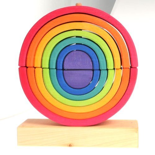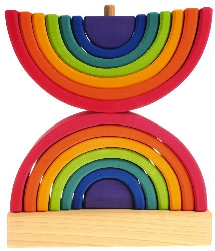 This delightful tower will accompany your child for many years and with care, can even be passed on to future generations. Toddlers, children (and even adults) will discover many different stacking arrangements for the arches, either on the tower stand or on another surface. The pieces can also be sorted according to height or color, as well as combined with other building blocks or wooden stackers (see Grimm's Large Elements Stackers). As they grow, children will find new uses for the rainbow arches in imaginative/pretend play: is it a tunnel, a seesaw, cradle, a home or a fence? The possibilities are endless. Your child's imagination will be sparked to think creatively and "outside the box."
