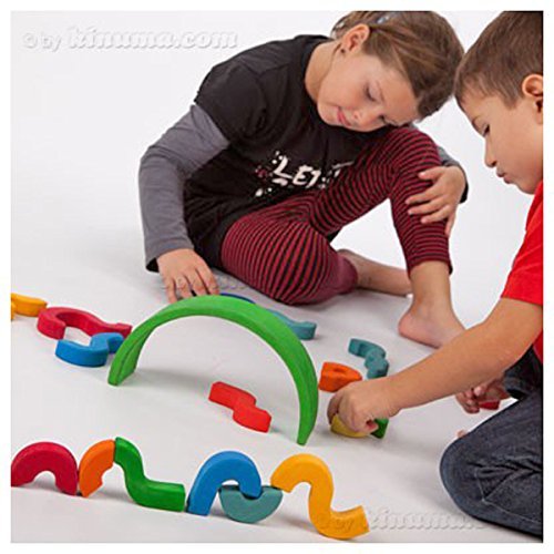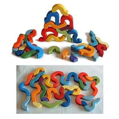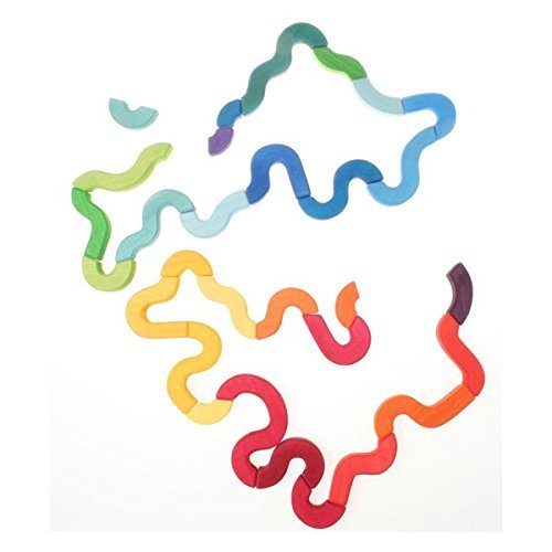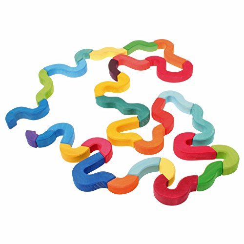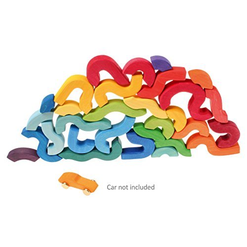 Intriguing patterns and unique structures may be made with this unique set of wooden curved squiggly blocks in colorful rainbow hues. Stack them to create a whimsical structure or set them end to end to create a winding road. Test children's logical thinking by getting them to try and make a circle or build a tower with these squiggly wooden shapes. It looks easy but can become tricky. You can also combine this set with any of the smaller 2x2 building blocks from Grimm's to create fantastic cities and scenes! Try to make a circle or see how high you can stack them! Or make a curvy track like the streets of Montecarlo and weave your cars along the walls!