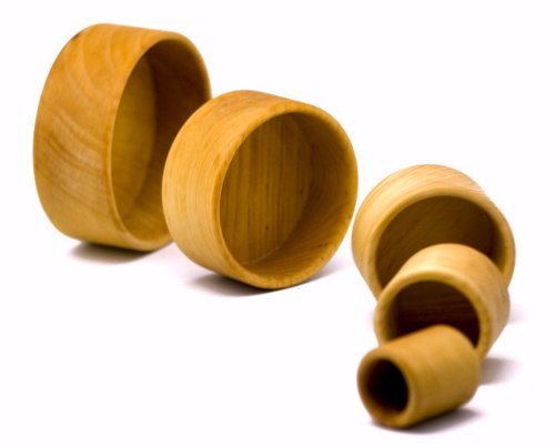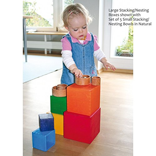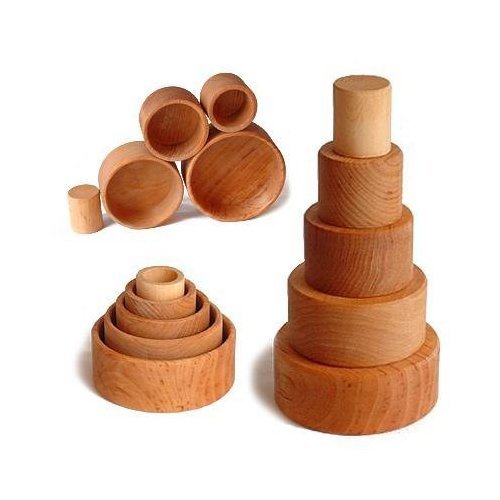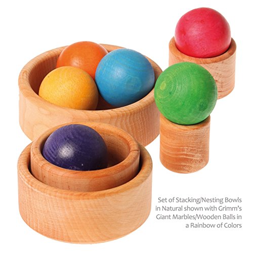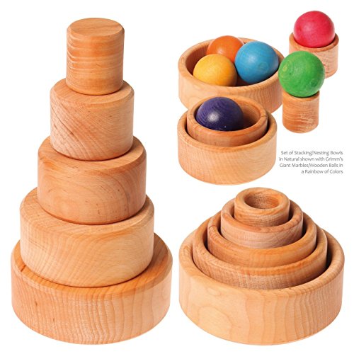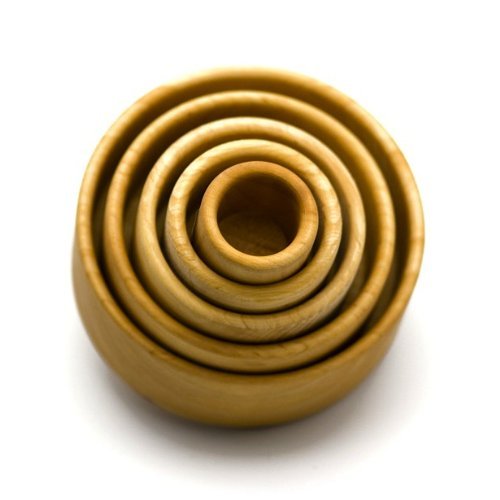 These five adorable little wooden bowls can be nested together, stacked in a variety of ways, or used imaginatively as play dishes and cups: these stacking bowls are incredibly versatile! While playing, young children can learn about size and sequencing as well as exercise their fine motor skills. Durable, heirloom-quality toy is a great addition to any daycare, preschool, or home. Stacked height is apx. 8 inches, apx. 4 inches in diameter. The largest bowl measures 4 in. diameter by 1.5-inches tall. The smallest bowl measures approximately 1.25-inches in diameter. Made in Germany. These small wooden bowls from Grimm's (in the rainbow colors) was a winner of the prestigious SPIEL GUT ("Good Toy") Award, -- a quality mark awarded by the German Design Association's Committee of Games and Toys. Such an award recognizes high quality children toys that are also ecologically sensible. This toy is made from European alder wood and finished with nontoxic, water based dyes. Wood is an ideal material for children's toys, as bacteria cannot reproduce on wood. Most Grimm's products are grinded by hand -- which gives a more charming expression compared to machined products. All dyes used are water based and in accordance with EN-71, are harmless to your health and suitable for children toys. The same is true for the natural oil used.