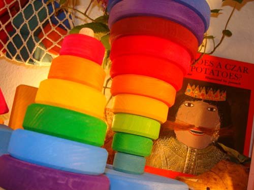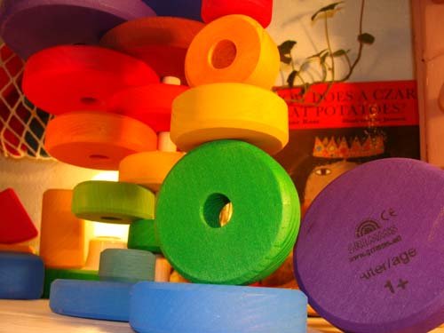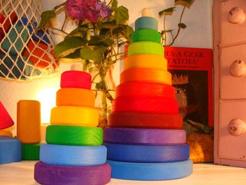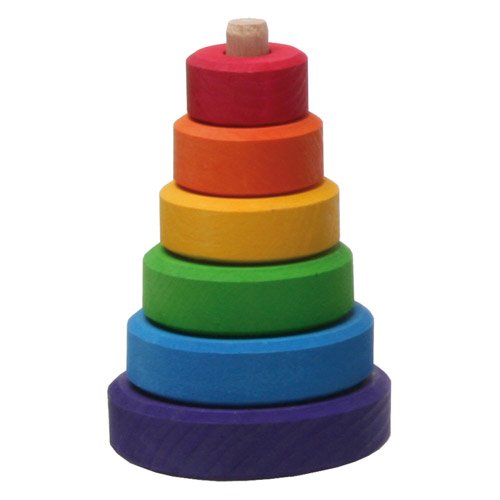ドイツ・Grimm's Spiel & Holz Design(グリムス社)のシュタイナー教育に基づく色鮮やかな知育積み木です。 大小の丸いパーツの積み木と土台となる棒の付いたパーツから成る円錐形の積み木。 赤ちゃんの頃は小さいパーツをおしゃぶりがわりに握らせたり、床でコロコロ転がしたり。 積み重ねられるようになったら自由な発想で積み重ねて遊びます。 棒にさせるようになったらパーツの大きさを感覚で覚えながら積み重ねてみましょう。 また、パーツを何かに見たてて遊ぶこともできます。 ひとつのおもちゃで何通りもの遊びができる、シンプルでも奥が深いおもちゃです。 個々の積み木はしっかりとした面取りがなされ、自然なさわり心地。 独特の水性着色料を使用し、厳しい安全基準に基づいて作られており、赤ちゃんが舐めてしまっても安心してお使いいただけます。
