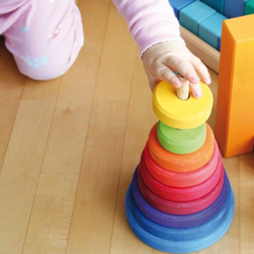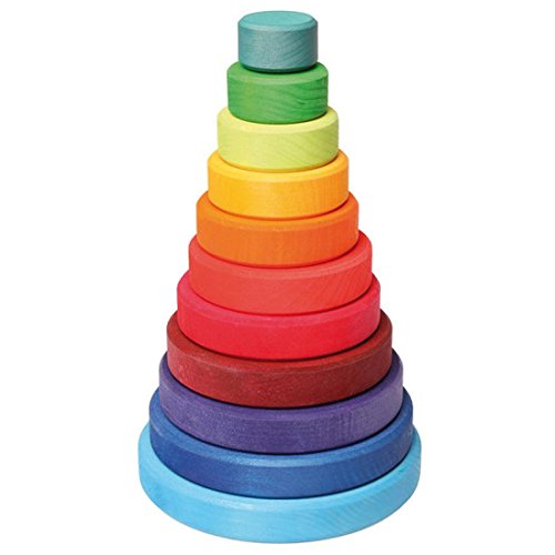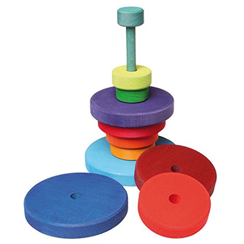 ドイツ・Grimm's Spiel & Holz Design(グリムス社)のシュタイナー教育に基づく色鮮やかな知育積み木です。 大小の丸いパーツの積み木と土台となる棒の付いたパーツから成る円錐形の積み木。 赤ちゃんの頃は小さいパーツをおしゃぶりがわりに握らせたり、床でコロコロ転がしたり。 積み重ねられるようになったら自由な発想で積み重ねて遊べます。 棒にさせるようになったらパーツの大きさを感覚で覚えながら積み重ねてみましょう。 また、パーツを何かに見たてて遊ぶこともできます。 ひとつのおもちゃで何通りもの遊びができる、シンプルでも奥が深いおもちゃです。 個々の積み木はしっかりとした面取りがなされ、自然なさわり心地。 ドイツ製の積み木で、独特の水性着色料を使用し、厳しい安全基準に基づいて作られており、赤ちゃんが舐めてしまっても安心してお使いいただけます。