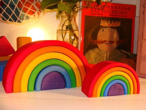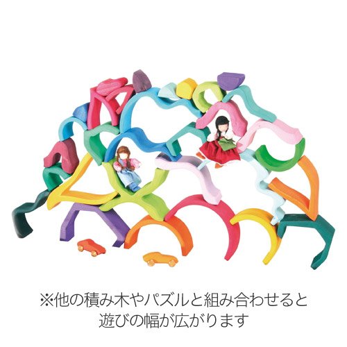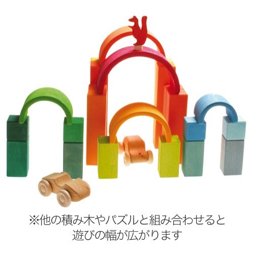 ドイツ・Grimm's Spiel & Holz Design(グリムス社)の一つの木を切って入れ子にした色鮮やかなトンネル型の積み木です。 シュタイナー教育に基づいた知育積み木は、赤ちゃんのおもちゃとして人気です。 お部屋に広げるだけで、そこが道路に早変わり。トンネルとして遊んだり、積み重ねてタワーにしたり、ゆらゆらシーソー遊びなど、想像力たっぷりに遊べる積み木です。 無毒性の独特の水性着色料で仕上げていますので、赤ちゃんが舐めても安全ですので安心してお使いいただけます。 個々の積み木はしっかりとした面取りがなされ、自然なさわり心地。 可愛らしい色使いはインテリアとしても素敵ですね。