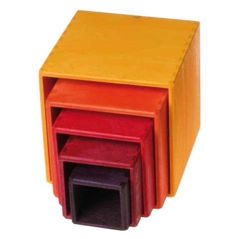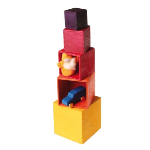 シュタイナー教育に基づくおもちゃを作り続けている、ドイツ・Grimm's Spiel & Holz Design(グリムス社)の色鮮やかな入れ子遊びや積み重ね遊びが楽しめるおもちゃスタッキングボックスです。 インテリアとして、赤ちゃんの木のおもちゃとしても人気です。 積み重ねた高さが36cmになる色鮮やかな木製ボックスの5個セット。 積み重ねてタワーにしたり、人形のお部屋にしたり、小さなおもちゃをしまったり。。。 子供たちの想像力の赴くままに遊べます。 美しい色彩は、舐めても安全な水性塗料を使用し、赤ちゃんの頃から安心してお使いいただけます。 アイデアしだいでひとつのおもちゃで何通りもの遊びができる、シンプルでも奥が深いおもちゃです。