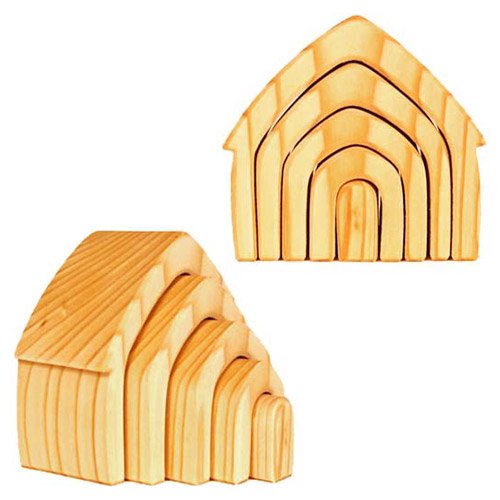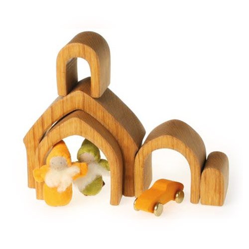 ドイツ・Grimm's Spiel & Holz Design(グリムス社)の一つの木を切って入れ子にしたナチュラルなお家の形の積み木です。 シュタイナー教育に基づいた知育積み木は、赤ちゃんのおもちゃとして人気です。 上質なエルダー材を無毒性の植物性オイルで仕上げていますので、赤ちゃんが舐めても安全ですので安心してお使いいただけます。 個々の積み木はしっかりとした面取りがなされ、自然なさわり心地。 お家やトンネルに見立ててごっこ遊びに使用したり、上に高く積み上げたりと、こども達の想像力に任せて思いっきり遊べます。 ひとつのおもちゃで何通りもの遊びができるシンプルでも奥が深いおもちゃです。 ナチュラルな木のおもちゃはインテリアとしても素敵ですね。