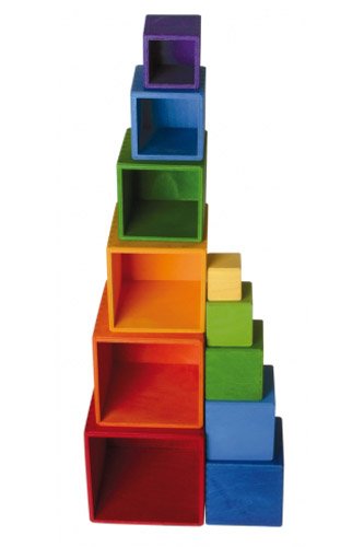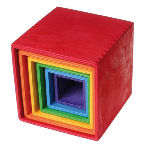 シュタイナー教育に基づくおもちゃを作り続けている、ドイツ・Grimm's Spiel & Holz Design(グリムス社)の色鮮やかな入れ子遊びや積み上げ遊びが楽しめるおもちゃスタッキングボックスです。 インテリアとして、赤ちゃんの木のおもちゃとしても人気です。 積み重ねた大きさが65cmにもなる特大の木製ボックスの6個セット。 積み重ねてタワーにしたり、人形のお部屋にしたり、小さなおもちゃをしまったり。。。 こどもたちの想像力の赴くままに遊ぶことができます。 美しい色彩は、舐めても安全な水性塗料を使用し、赤ちゃんの頃から安心してお使いいただけます。 アイデアしだいでひとつのおもちゃで何通りもの遊びができる、シンプルでも奥が深いおもちゃです。