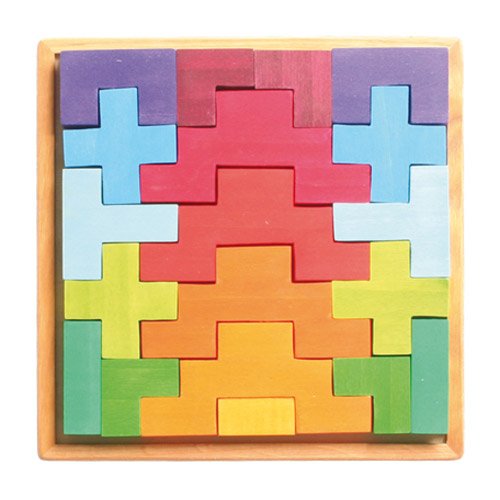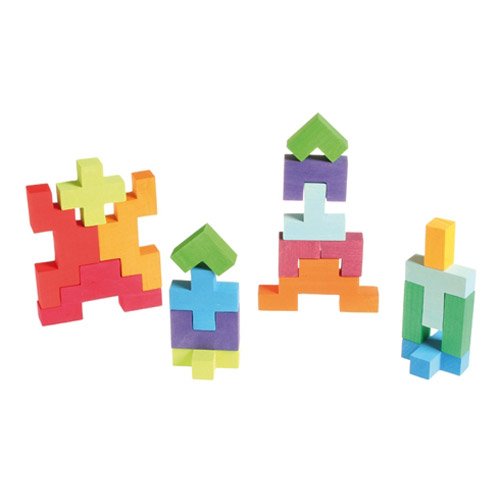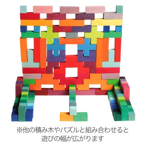 ドイツGrimm's Spiel & Holz Design(グリムス社)の美しい色彩の積み木19ピースセットです。 様々な形の積み木を使って、子供たちの想像力の赴くままに、積み上げたり、いろいろな造形物が作れます。 他の積み木と組み合わせると、作れる造形物も増えて、遊びの幅が広がります。 美しい色彩の積み木は、独特の水性着色料を使用し、厳しい安全基準に基づいて作られていますので、お子さまが舐めてしまっても安心してお使いいただけます。 遊び終わったら、木製フレームにパズルの様にお片づけできます。 上手に積み木を片付けられるかな? シュタイナー教育に基づいた知育積み木は、創造性と色彩感覚を高めます。