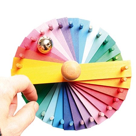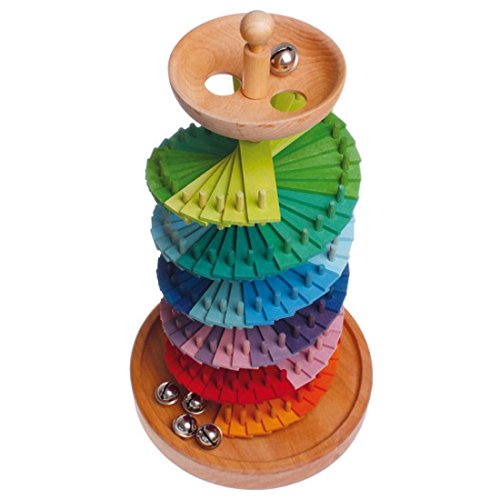 ドイツGrimm's Spiel & Holz Design(グリムス社)の美しい色彩の組み立て式の2重螺旋の木製クーゲルバーン(スロープトイ)です。 真ん中に穴のあいた80ピースの木製パネルを土台の支柱に通して、カラフルな玉の塔と組み立てましょう! ベルを転がして、どの色がどんな音がするかよく耳をそばだてて聞いてみましょう。 パネルよって音の違いも楽しめるので、何度もくり返しスロープを組み立てて、ボール転がしが楽しめます。