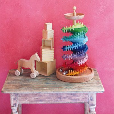 - 美しい色彩の組み立て式の2重螺旋の木製スロープトイです。カラフルな玉の塔と組み立てましょう!