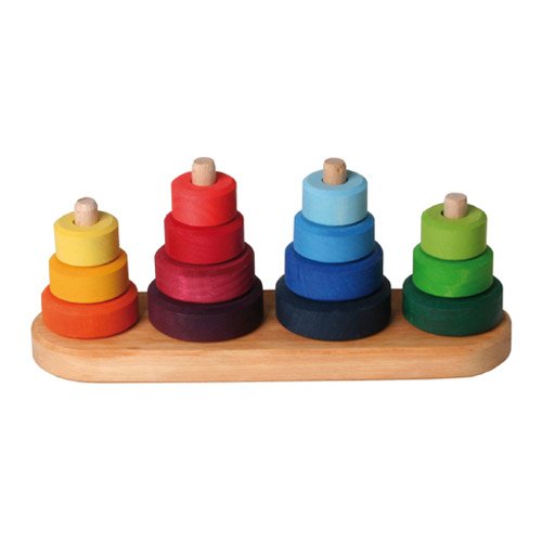 ドイツ・Grimm's Spiel & Holz Design(グリムス社)のシュタイナー教育に基づく色鮮やかな円錐積み木です。 赤ちゃんの頃は小さいパーツを握らせたり、床でコロコロ転がしたり。 積み重ねられるようになったら自由な発想で積み重ねて遊びます。 棒にさせるようになったらパーツの大きさを感覚で覚えながら積み重ねてみましょう。 積み木を何かに見たてて遊ぶこともできます。 ひとつで何通りもの遊びができる、シンプルでも奥が深いおもちゃです。 他の積み木と組み合わせると、遊びの幅が広がります。 美しい色彩の積み木は、独特の水性着色料を使用し、厳しい安全基準に基づいて作られていますので、赤ちゃんが舐めてしまっても安心してお使いいただけます。 シュタイナー教育に基づいた知育積み木は、赤ちゃんのおもちゃとして人気です。創造性と色彩感覚を高めます。