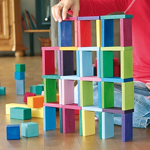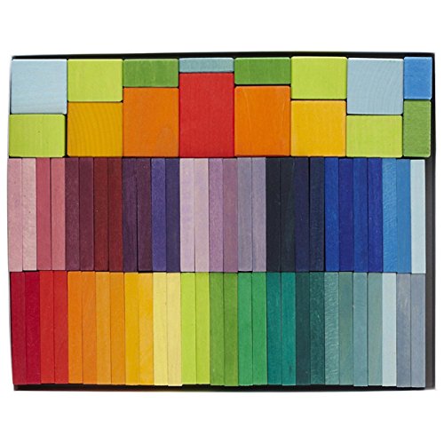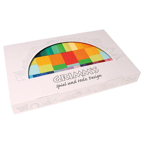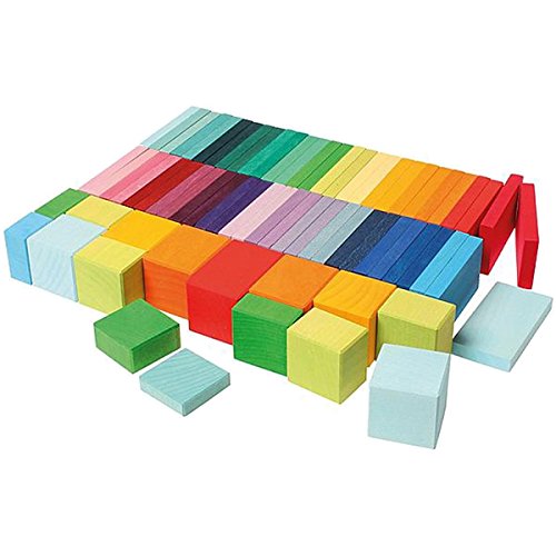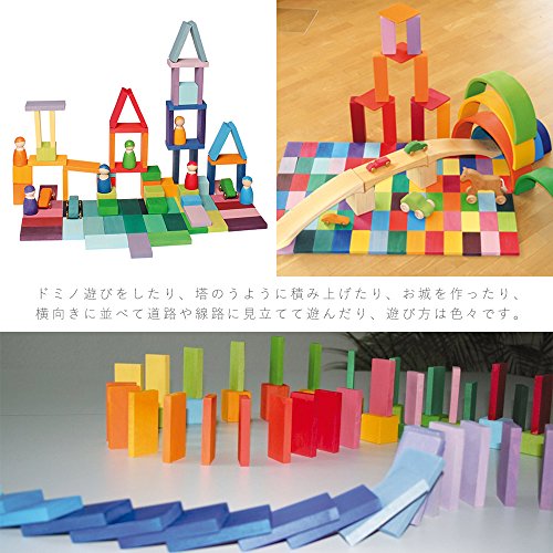 ドイツGrimm's Spiel & Holz Design(グリムス社)の29色のグラデーションで構成された色鮮やかなレインボーカラーの積み木です。 カラーチャートブロックは、板状のドミノ積み木と数種類の幅のブロック型積み木で構成されています。 ドミノ積み木は、29色のグラデーションで構成されていて、色の順番に並べたり、グループに分けたり、遊びながら色彩感覚が育まれます。 ドミノ遊びをしたり、塔のうように積み上げたり、お城を作ったり、横向きに並べて道路や線路に見立てて遊んだり、遊び方は色々です。 他の積み木やおもちゃと組み合わせると、遊びはどんどん広がります。 無毒性の独特の水性着色料で仕上げていますので、赤ちゃんが舐めても安全ですので安心してお使いいただけます。
