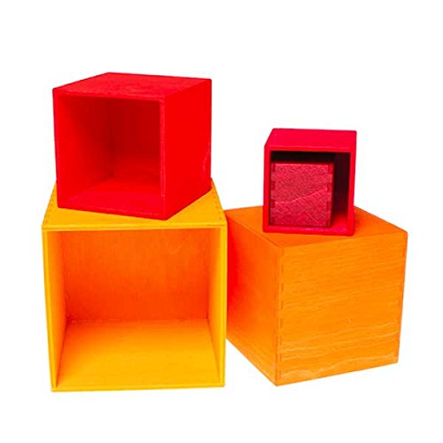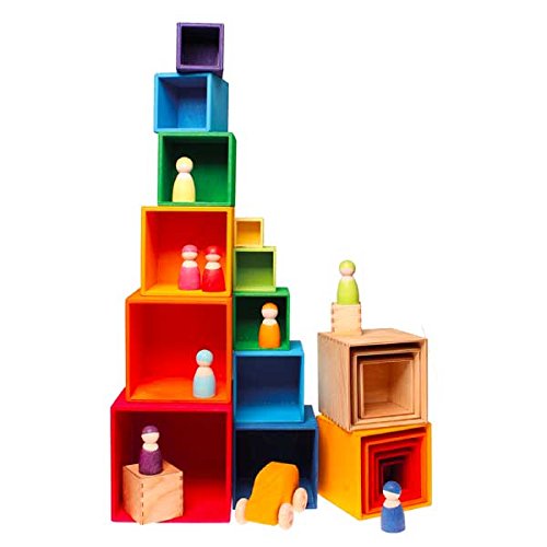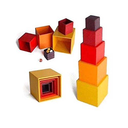 シュタイナー教育に基づくおもちゃを作り続けている、ドイツ・Grimm's Spiel & Holz Design(グリムス社)の色鮮やかな入れ子遊びや積み重ね遊びが楽しめるおもちゃスタッキングボックスです。 インテリアとして、赤ちゃんの木のおもちゃとしても人気です。 積み重ねた高さが36cmになる色鮮やかな木製ボックスの5個セット。 積み重ねてタワーにしたり、人形のお部屋にしたり、小さなおもちゃをしまったり。。。 子供たちの想像力の赴くままに遊べます。 美しい色彩は、舐めても安全な水性塗料を使用し、赤ちゃんの頃から安心してお使いいただけます。 アイデアしだいでひとつのおもちゃで何通りもの遊びができる、シンプルでも奥が深いおもちゃです。