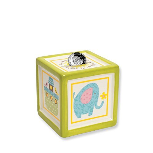 Colorful ceramic bank from our Noah's Animals collection is 3 high with coin slot on top and rubber stopper on the bottom.;Decorative keepsake piggy bank is a wonderful addition to any nursery. Makes perfect first bank for new baby or as a gift for a baby shower.;Gift boxed to make the perfect baby shower or welcome home gift.;God keeps His promises is inscribed on the top next to the coin slot.;Small cubed size is perfect keepsake to hold throughout the years and fits with any size nursery decor.