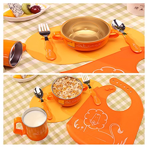 - 6点 セット -- ビブ & 片手カップ & ご飯茶碗 & ベビースプーン & ベビーフォーク & コースター。