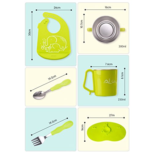 - 6点 セット -- ビブ & 片手カップ & ご飯茶碗 & ベビースプーン & ベビーフォーク & コースター。