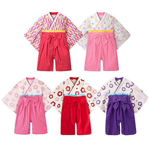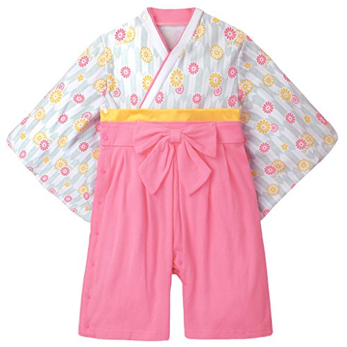 GudeHome 女の子 袴風 カバーオール ロンパース 和装フォーマル 着物 ベビー服 長袖 コスチューム 綿100% (ピンク 90cm)