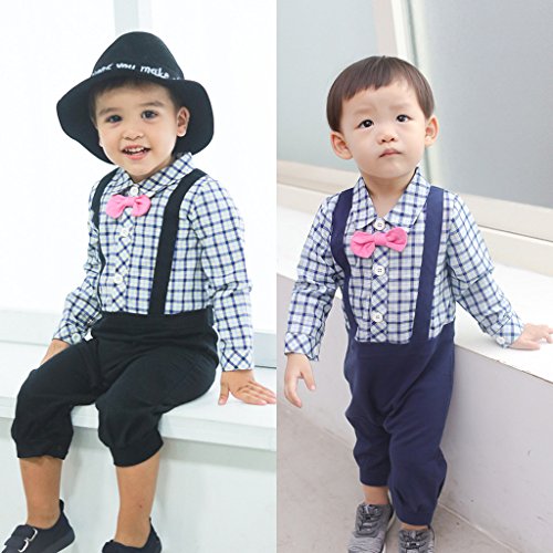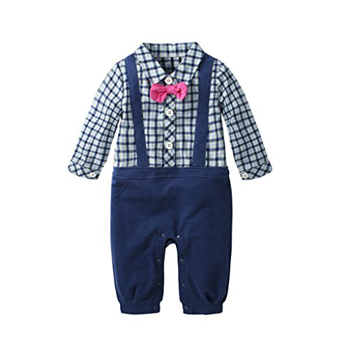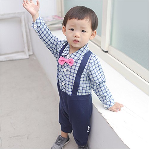 GudeHome 赤ちゃん ロンパース 男の子 カバーオール 紳士風 子供フォーマル服 ベビー 春秋着 蝶ネクタイ付き 格子縞 子供洋服 出産祝い お出かけ 結婚式 写真撮影 ブルー 90
