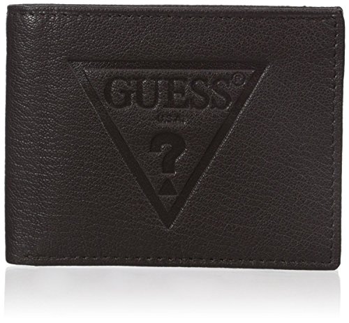 Guess logo trifold men's wallet a large embossed triangle Guess logo on the front. Includes a gift box. Wallet dimensions are 3.5 x 4.5 . Interior features 7 credit card slots, 2 hidden pockets, 1 clear id slot and 1 bill pocket with divider.