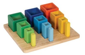 Made from eco-friendly rubber wood and stained with low VOC aniline dyes The unique design of this wooden manipulative allows for several exciting ways to play and learn. The brightly colored cubes are graduated in size and nest together, inspiring exploration and promoting fine-motor and shape-recognition skills.