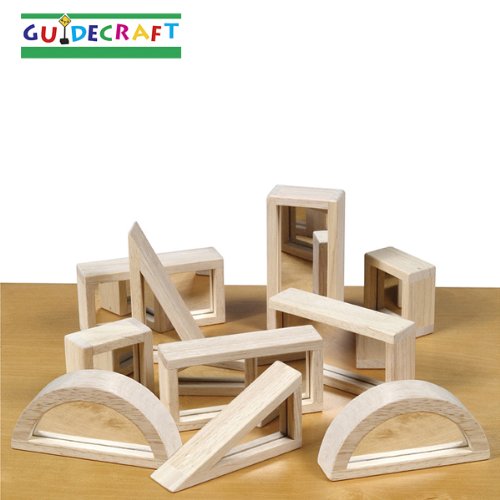 This set of ten mirror blocks feature hardwood frames with soft, rounded corners and Mylar mirrored double faced interiors. Little ones will spend hours building whatever their minds can imagine with this flashy mirror block set Features:Set of 10 blocksWood constructionVarious standard shapesMylar mirror interior